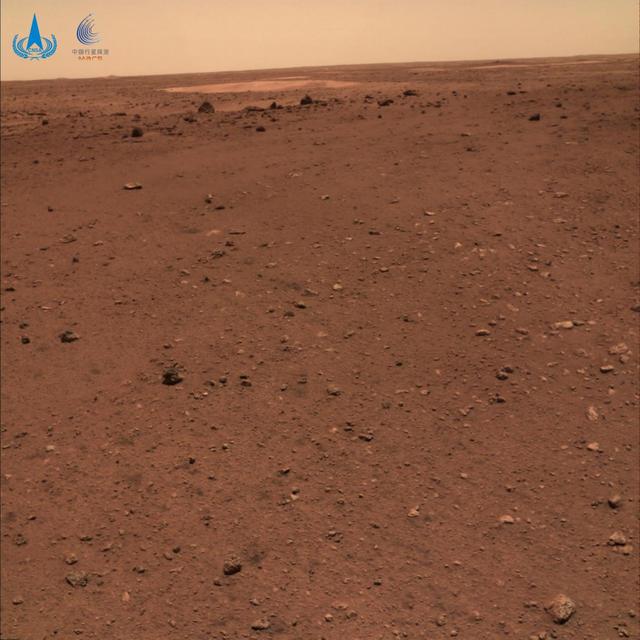 著陸點全景圖,是火星車尚未駛離著陸平臺時,由火星車桅桿上的導(dǎo)航地形相機(jī),進(jìn)行360°環(huán)拍,經(jīng)過校正和鑲嵌拼接而成。圖像顯示,著陸點附近地勢平坦,遠(yuǎn)處可見火星地平線,石塊豐度和尺寸與預(yù)期一致,表明著陸點自主選擇和懸停避障實施效果良好。