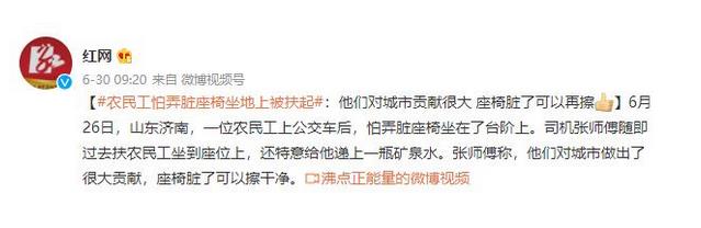 6月26日,山東濟南,一位農(nóng)民工上公交車后,怕弄臟座椅坐在了臺階上。司機張師傅隨即過去扶農(nóng)民工坐到座位上,還特意給他遞上一瓶礦泉水。張師傅稱,他們對城市做出了很大貢獻,座椅臟了可以擦干凈。