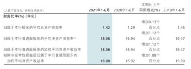 2021年1-6月,招商銀行歸屬于公司普通股股東的加權(quán)平均凈資產(chǎn)收益率為18.06%,比上年同期增加1.12個百分點;扣除非經(jīng)常性損益后歸屬于公司行普通股股東的加權(quán)平均凈資產(chǎn)收益率為18.00%,比上年同期增加1.08個百分點。